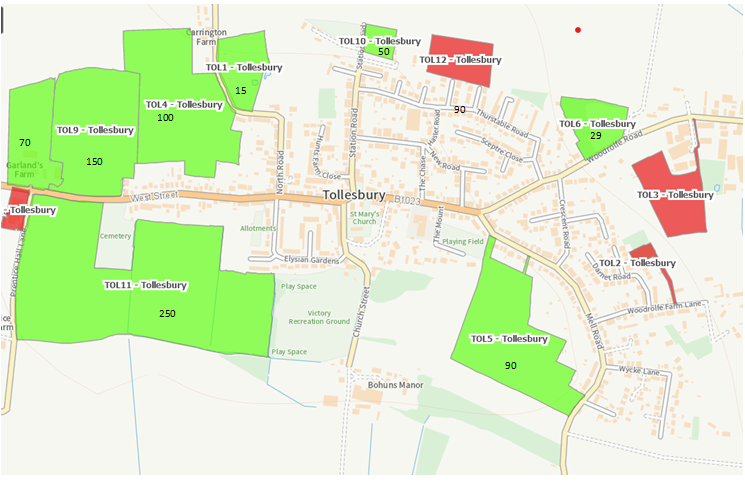 From a Tollesbury village perspective, whilst 12 sites were assessed for possible development, 4 sites were considered not suitable (red), with 8 sites considered suitable (green). Maldon District Council estimate that if all 8 sites were developed then the 8 sites may result in an increase of 754 housing units in the village, 169 housing units to the east of Station Road and 585 housing units to the west of Station Road.